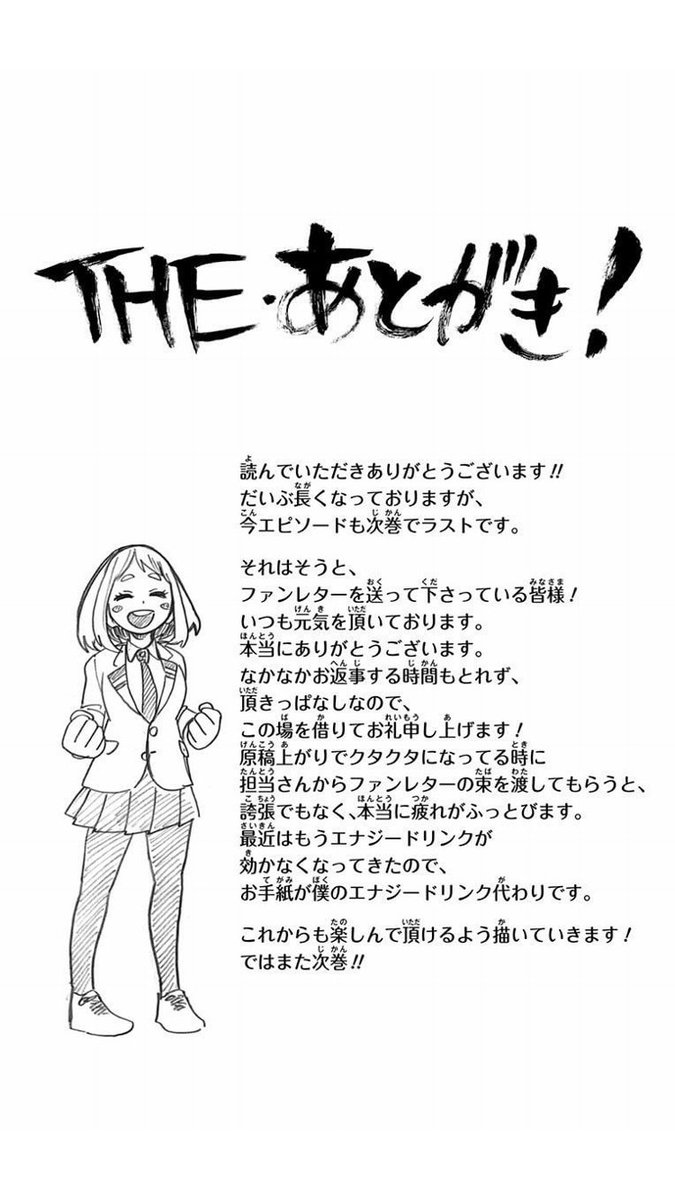 Horikoshi thanks his fans for their letters in regard to his well being. He says that not even energy drinks work anymore so he’s using fan letters to energize himself instead, and thanks everyone.